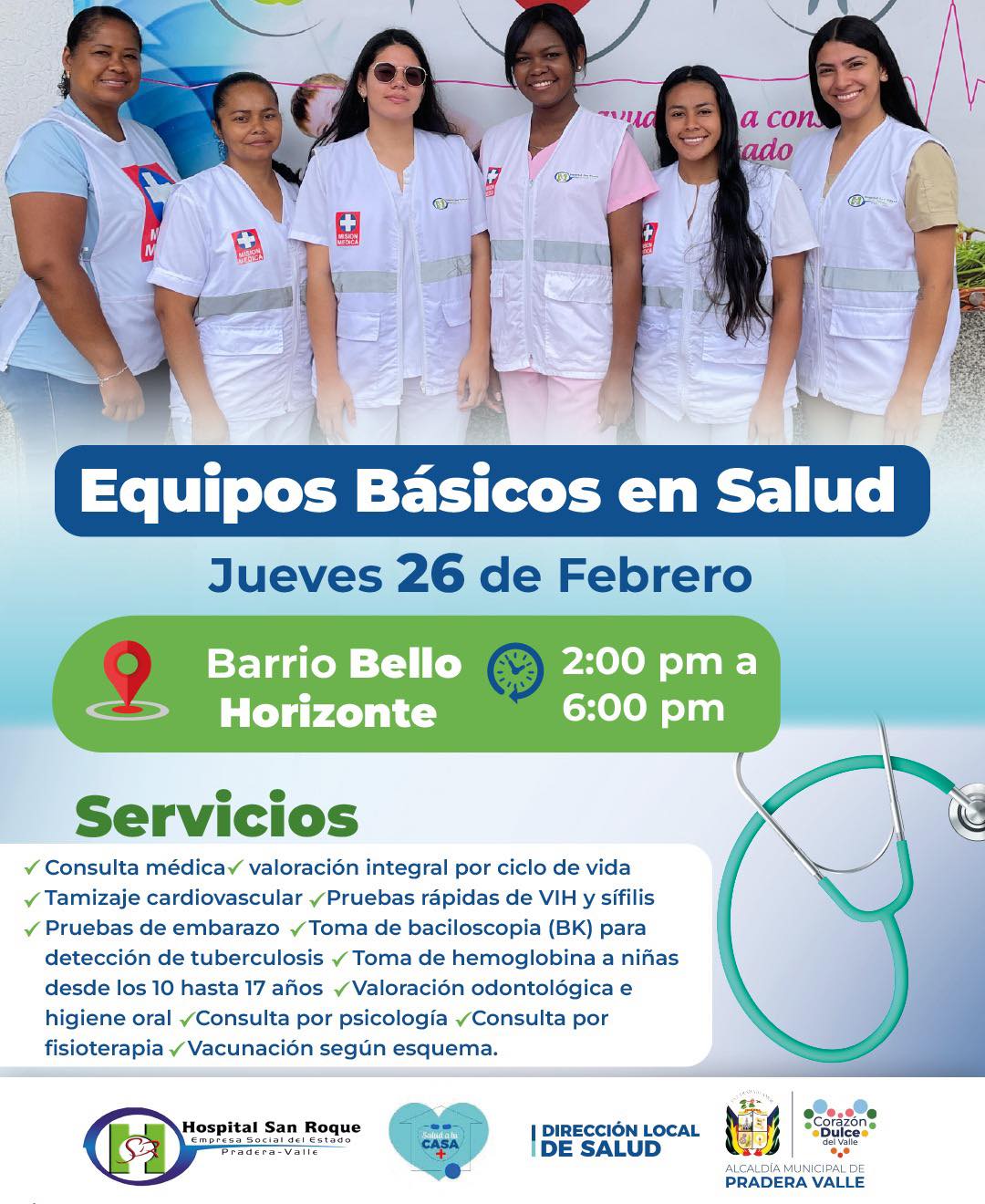 La salud llega al barrio Bello Horizonte 🏥❤️🩺Te invitamos a nuestra Jornada de Salud, donde brindaremos atención médica, vacunación, control de presión arterial, asesoría en promoción, prevención y mucho más.🚑Cuidarnos es tarea de todos. ¡Te esperamos!