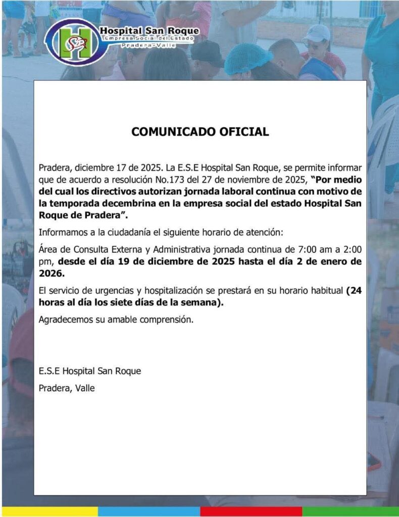 18 diciembre 2025 Sin categoría 🚨 Atención 🚨 Comunicado oficial de la E.S.E Hospital San Roque del municipio de Pradera. ¡Juntos seguimos construyendo servicios de salud con calidad! By Hospital Admin 0 0