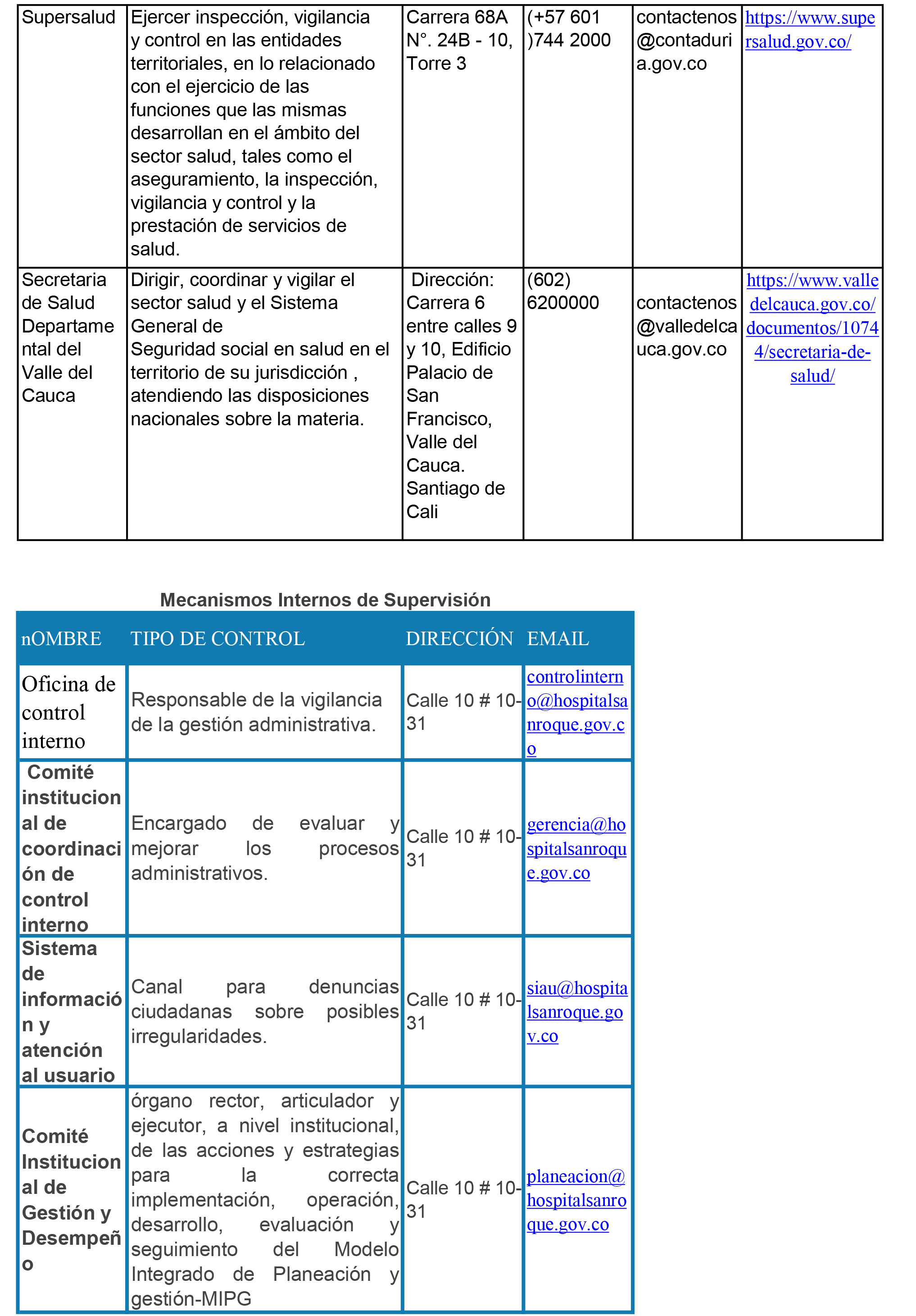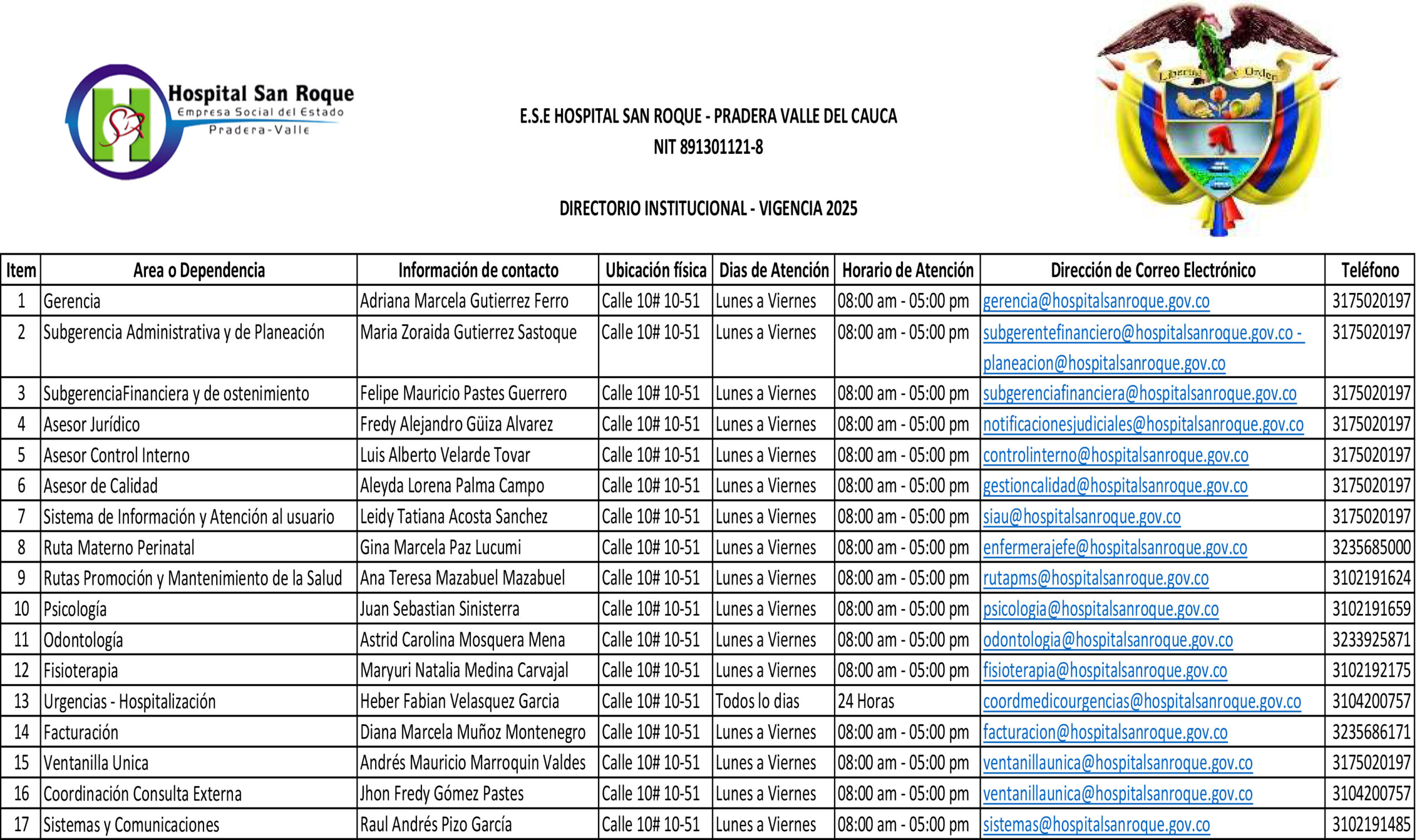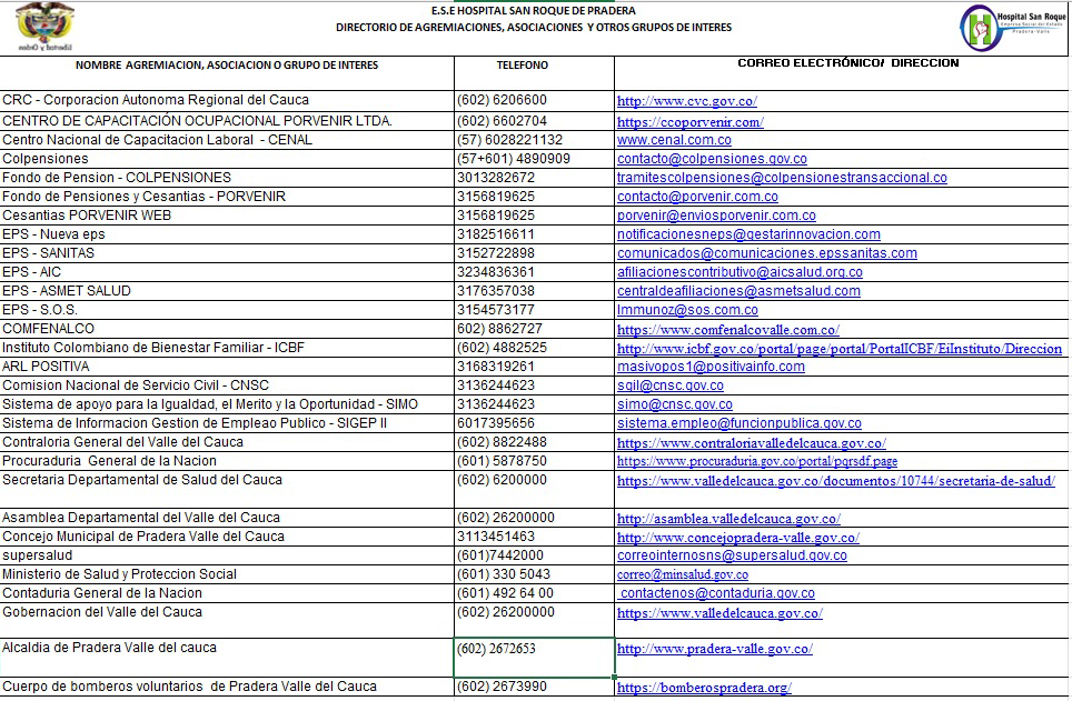 Clasificada como nivel 1 de atención, la Empresa Social del Estado Hospital San Roque de Pradera, Valle del Cauca, tiene su domicilio en la calle 10 número 10-51, y con número telefónico 267-0520